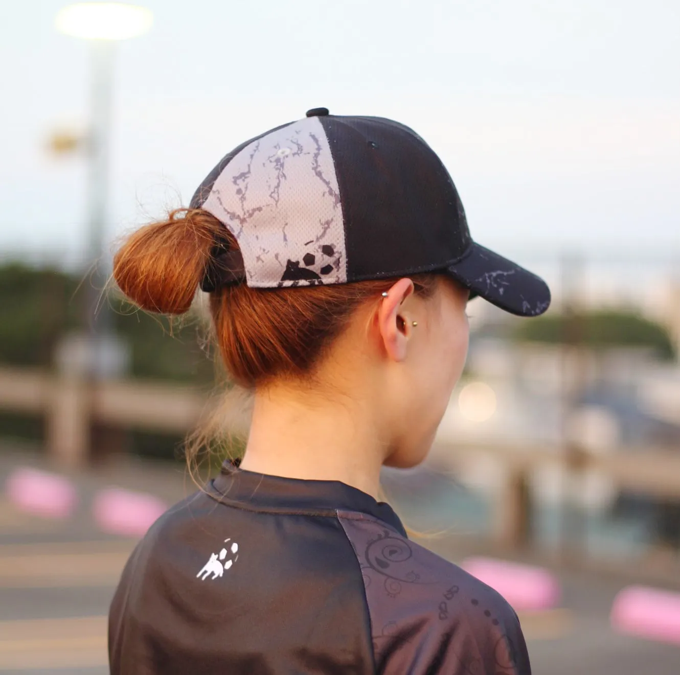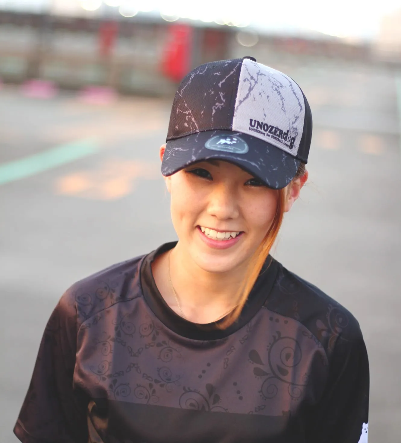 スポーツキャップ。ブラックにマーブル柄を施したデザインはどんなシーンでもカッコよく着用できます。グレージュのアクセントがさらに引き締めます。